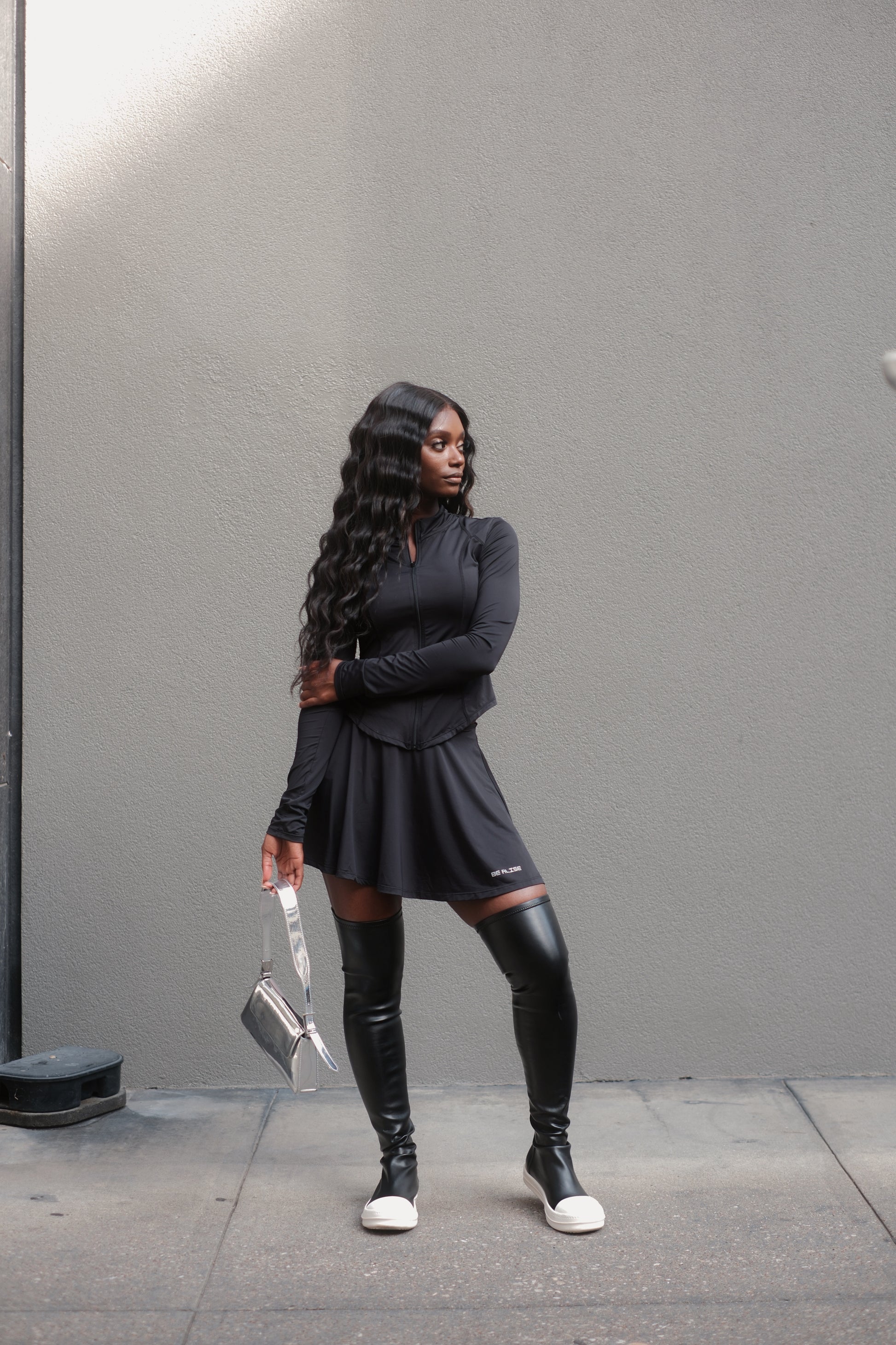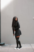 Take your wardrobe to the next level with our Brittany Skirt Set, featuring a sleek flair skirt and matching zip-up crop jacket. Designed for the woman who commands attention, this set combines contemporary style with all-day comfort. The skirt flatters your curves in all the right places, while the fitted crop jacket adds a sporty edge. Crafted from premium, breathable, stretchable material, this set is as versatile as it is chic. Wear the set together for a coordinated look, or mix and match with your wardrobe for endless outfit possibilities. Dress it up with heels for a night out or with sneakers for a sporty look. The Brittany Skirt Set isn't just an outfit---it's a statement!
